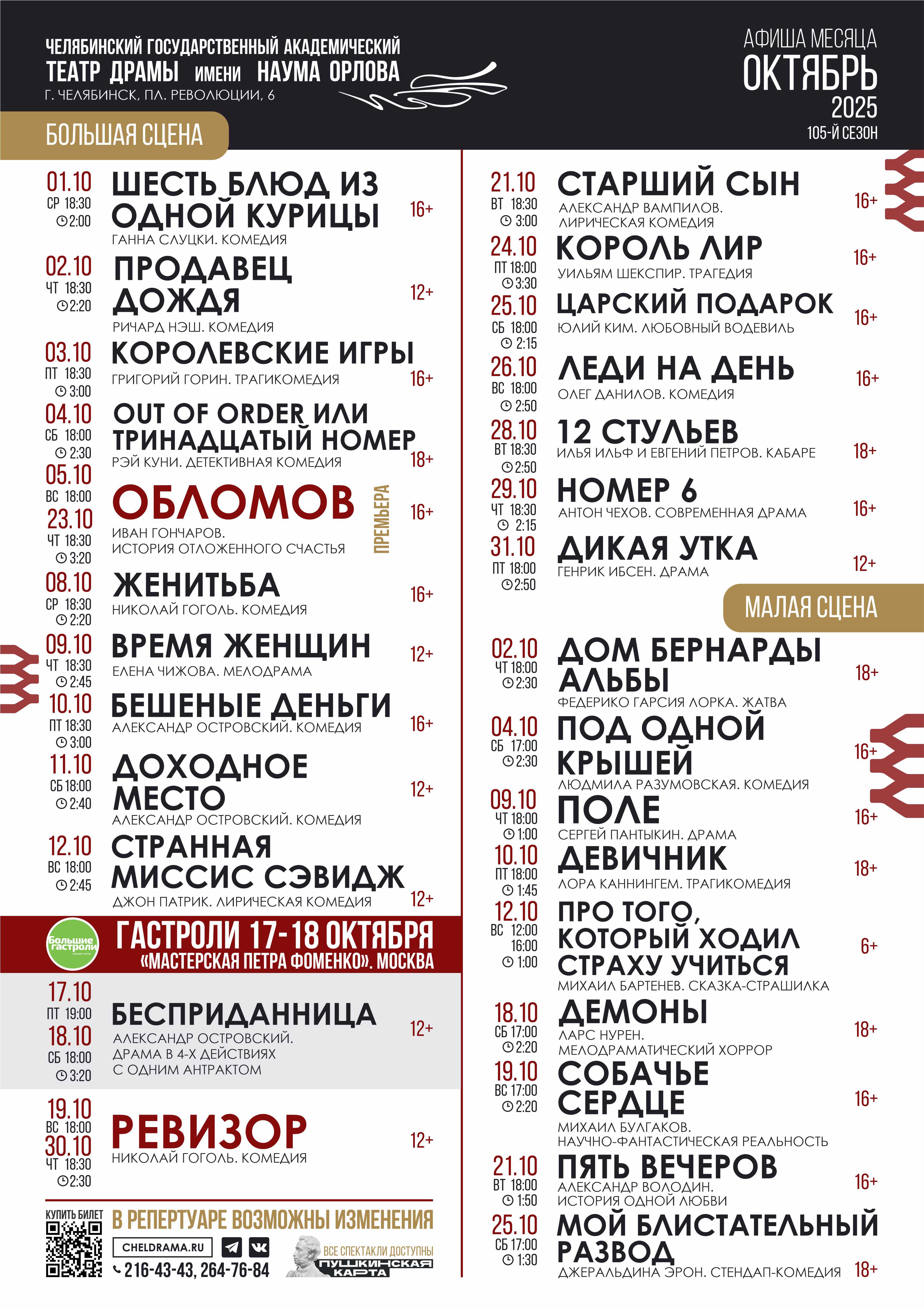 Дорогие зрители! Спешите зарядиться положительными эмоциями и насладиться нашей согревающей атмосферой этой осенью. Уже на следующей неделе предлагаем вам целый ряд вдохновляющих спектаклей, от классических комедий до современных драм, от веселых приключений до трогательных историй. Каждый спектакль — это приглашение окунуться в теплый мир искусства, полного ярких эмоций и глубоких смыслов.