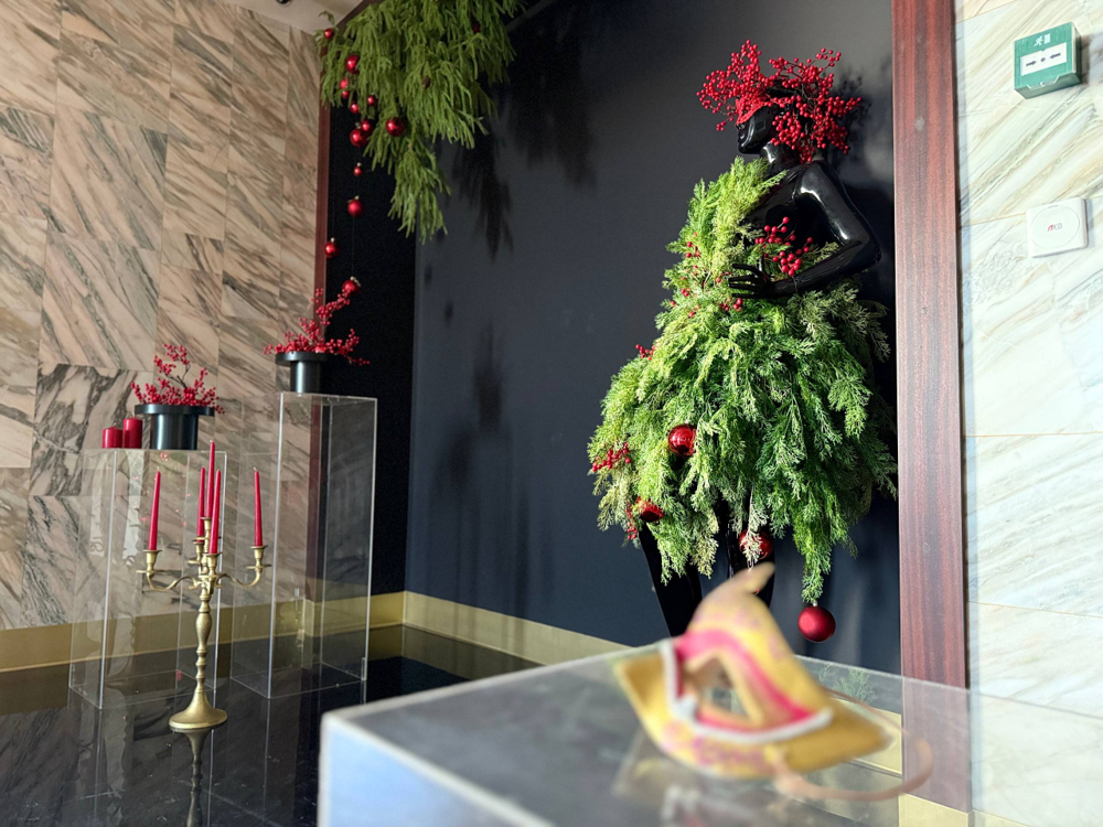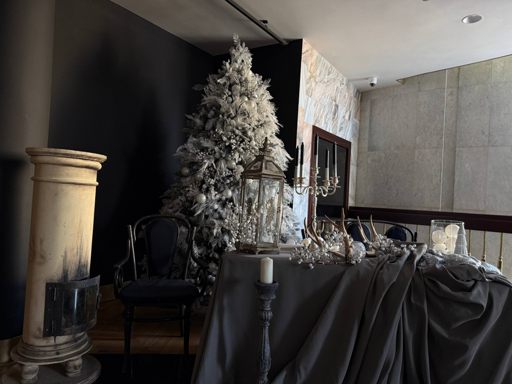Войдя в театр, вы сразу заметите роскошную ёлку необычного чёрного цвета: её элегантная, слегка загадочная сдержанность придаёт празднику современное очарование. В фойе на втором этаже возвышается наша традиционная театральная ёлка — изящная и благородная, украшенная в театральном стиле. Поднявшись выше, вы увидите две стильные фотозоны, где можно сделать эффектные снимки на память. Комплекс этого праздничного декора формирует многослойную, по-настоящему волшебную атмосферу.