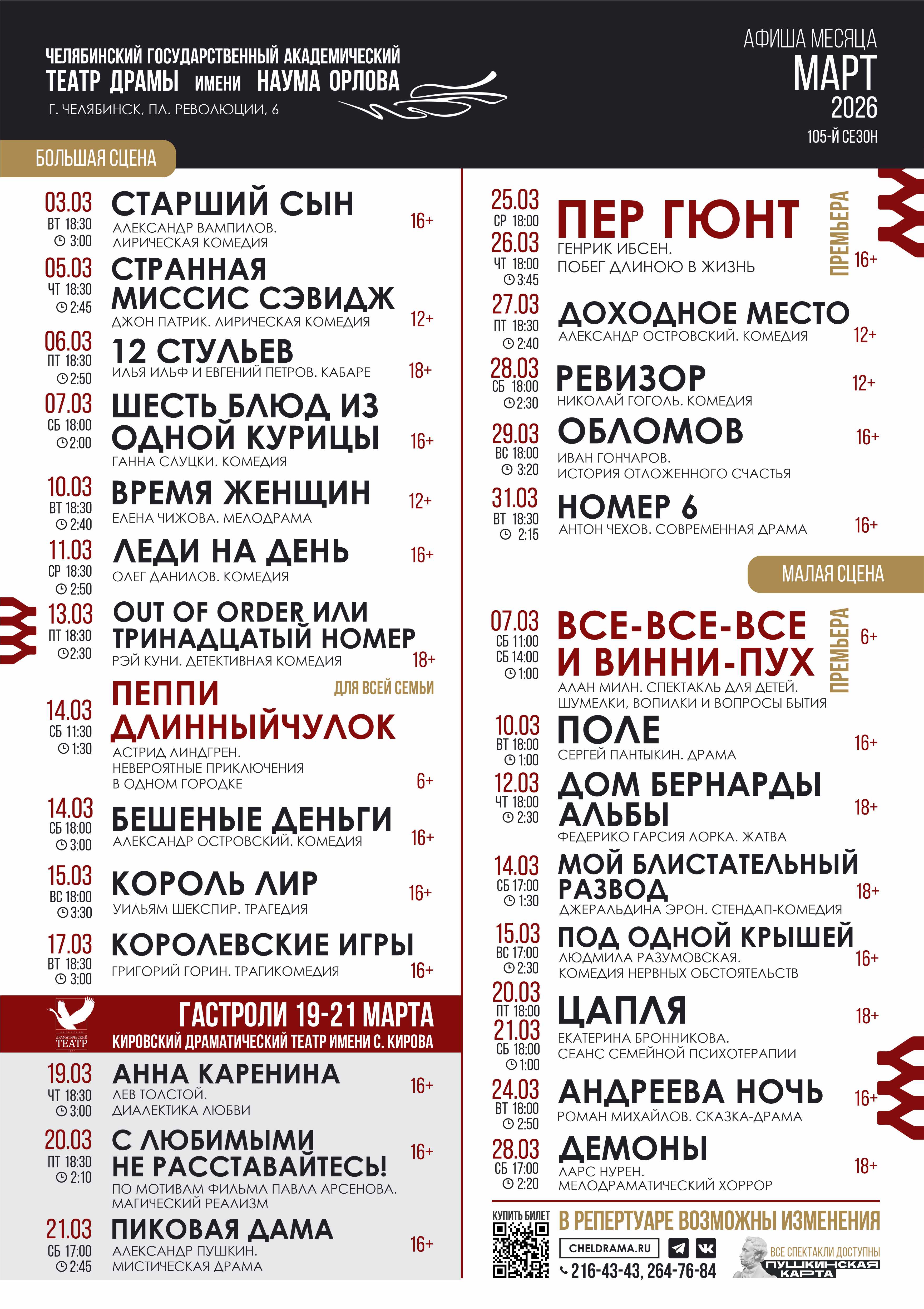 Наш театр открыт для семейного посещения, театральных свиданий и вдохновляющих вечеров в компании друзей. Но помните: хорошие места быстро раскупают — не проспите март!