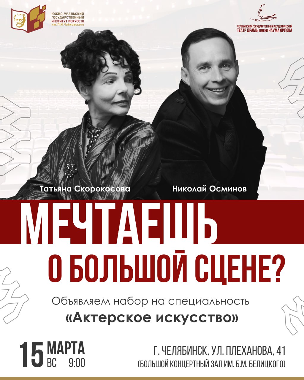 Внимание, абитуриенты! Южно-Уральский государственный институт искусств имени П. И. Чайковского объявляет приём на специальность 52.05.01 «Актёрское искусство» с квалификацией «Артист драматического театра и кино» (очная форма обучения).