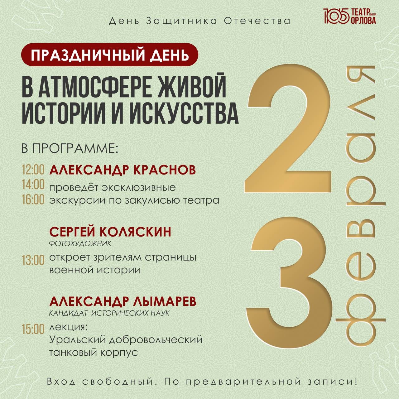 23 февраля — День защитника Отечества. В этот особенный день театр открывает свои двери, чтобы вместе почтить мужество и самоотверженность защитников, вспомнить подвиги прошлого и поблагодарить тех, кто стоит на страже сегодня.
